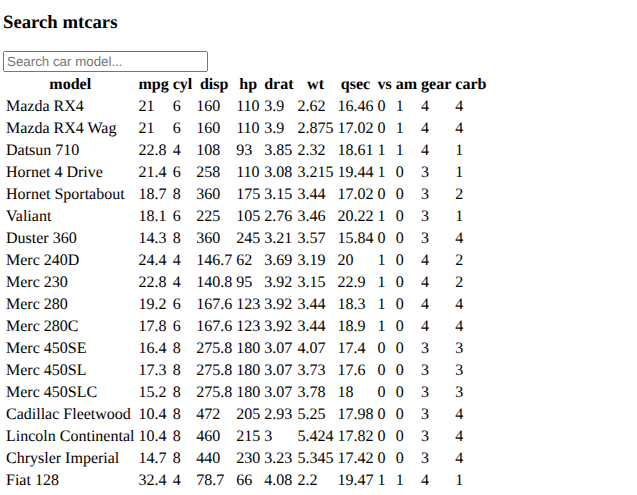 Perform live search on mtcars as user types keywords