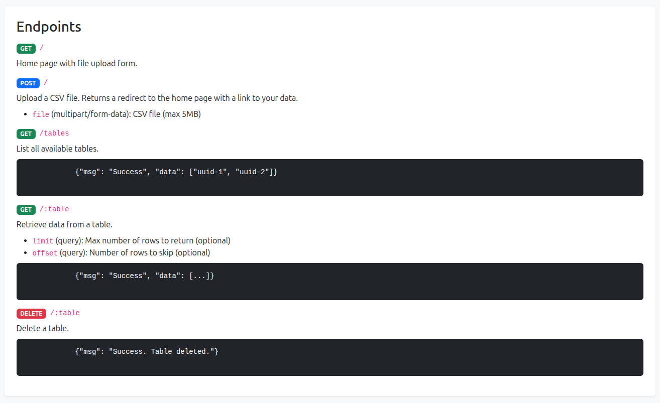 Upload a csv file, get API endpoints to the data.